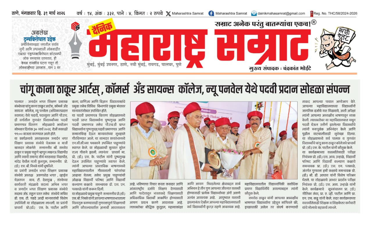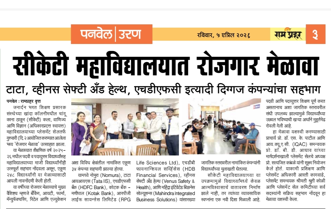 UG Fourth and Sixth Semester External Examination March 2026 M.Sc. Part II (IT, CS, Biotech.) Fourth Semester External Examination Timetable April 2026 M.COM Part I (Advanced Accountancy & Business Analytics Extermnal Examination Timetable April 2026 PG Part - I & II Regular and Repeater (ATKT) Second and Fourth Sem External Examination April 2026 PG Part I & II ATKT First, Third Semester External Examination February 2026 ATKT First, Third, Fifth Semester External Examination February 2026 ATKT First, Third, Fifth Semester External Examination February 2026 ATKT First, Third, Fifth Semester Internal Examination February 2026 Grand Finale of 24th Nayional Level MicrobiOlympiad 24th National Level Microbiolympiad 24th National Level MicrobiOlympiad VIKSIT BHARAT YUVA CONNECT PROGRAM -2025 Mega Job Fair 2025 Inauguration of Science Association for Academic Year 2025-26 Inauguration of Science Association for Academic Year 2025-26 Seminar on UPSC-MPSC-BANK/SSC/RAILWAY लोकनेते मा. श्री. रामशेठ ठाकूर साहेब यांच्या अमृत महोत्सवी वर्षनिमित्त आयोजित भव्य रक्तदान शिबीर Felicitation Ceremony of Meritorious Students FYBCOM (Acc & Fin) Second Merit List 2025-26 FYBCOM (Management Studies) Second Merit List 2025-26 FYBSC (BIOTECH) Second Merit List 2025-26 FYBSC (Computer Science) Second Merit List 2025-26 FYBSC (Information Technology) Second Merit List 2025-26 PG Part-II CKT Admission Notice 2025-26 F.Y.B.Sc. (I.T.) First Merit List 2025-26 F.Y.B.Sc. (Computer Science) First Merit List 2025-26 F.Y.B.Sc. (Biotechnology) First Merit List 2025-26 F.Y.B.Sc. First Merit List 2025-26 F.Y.B.COM. (Management Studies) - First Merit List - 2025-26 F.Y.B.COM. (Acc. & Fin.) First Merit List 2025-26 F.Y.B.COM. FIRST MERIT LIST 2025-26 F.Y.B.A. First Merit List 2025-26 College Prospectus 2025-26 TYBCOM Merit List 25-26 SYBSC Merit List 25-26 SYBCOM Merit List 25-26 SYBA Merit List 25-26 TY UG 2025-26 CKT Admission Notice SY UG 2025-26 CKT Admission Notice F.Y. - U.G. Merit List 2025-2026 INTERIOR & FASHION DESIGN New Courses in A.Y. 2025-26 ABC-ID Linking Guidelines Placement 2024-2025 ADMISSION PROCESS NOTICE ADMISSION NOTICE - F.Y. Admission FY PG 25-26 Accredited A++ Grade by NAAC (Fourth Cycle with 3.52 CGPA)